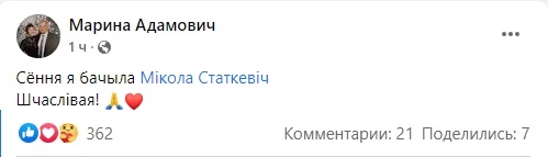 Марина Адамович встретилась в колонии с Николаем Статкевичем. Об этом жена политзаключенного сообщила на своей странице в Фейсбуке.